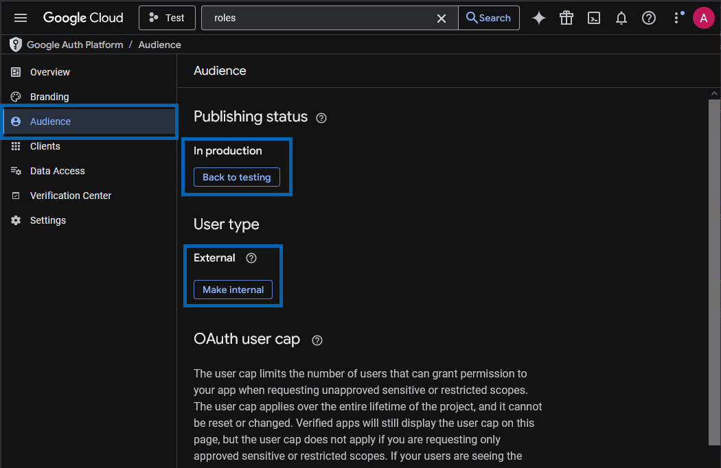 User Type: Select Internal (available only to organization accounts) or External (available to any Google account).