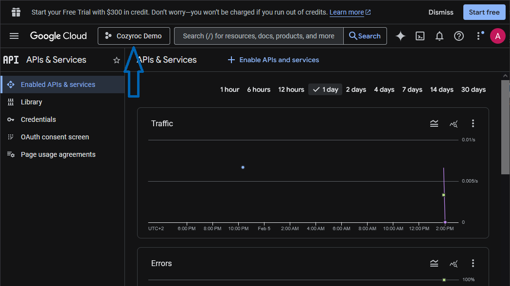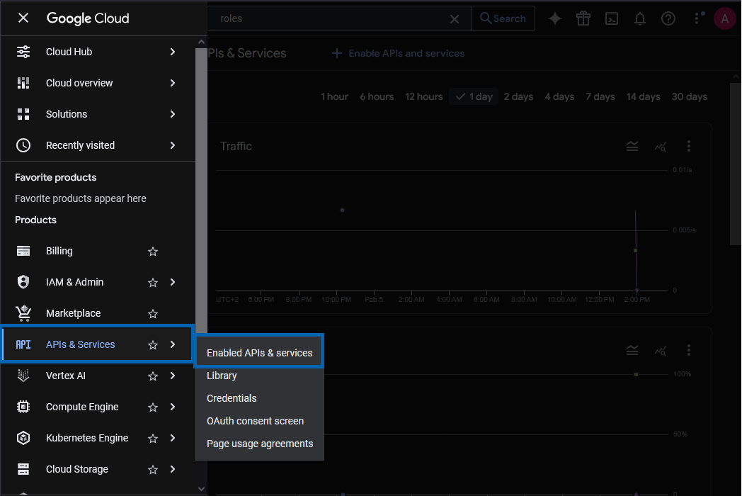 - Review available APIs; if a specific one (e.g., Google Cloud Monitoring) is missing, click Enable APIs and services to add it.