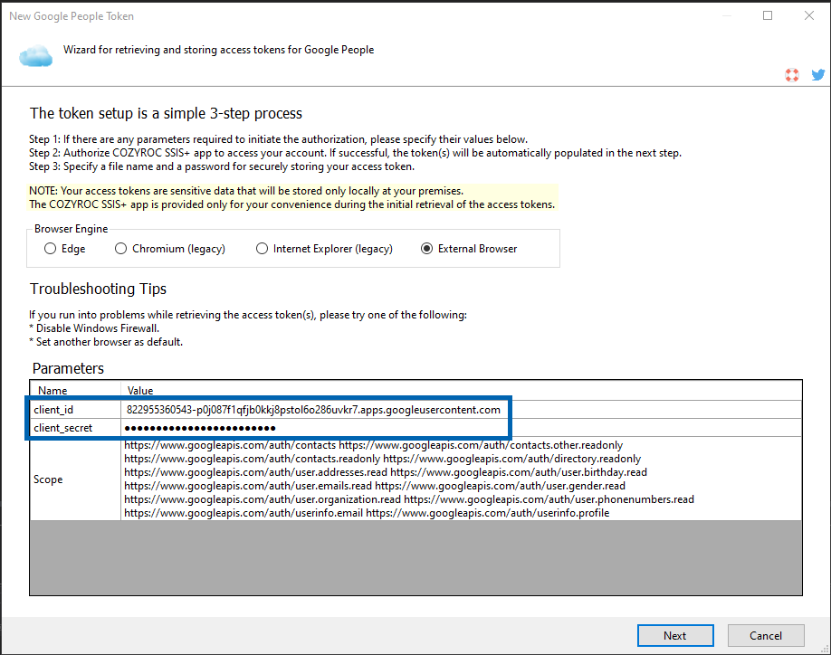 Paste these credentials into the COZYROC REST Connection Manager to complete the setup. Keep these credentials safe!.
