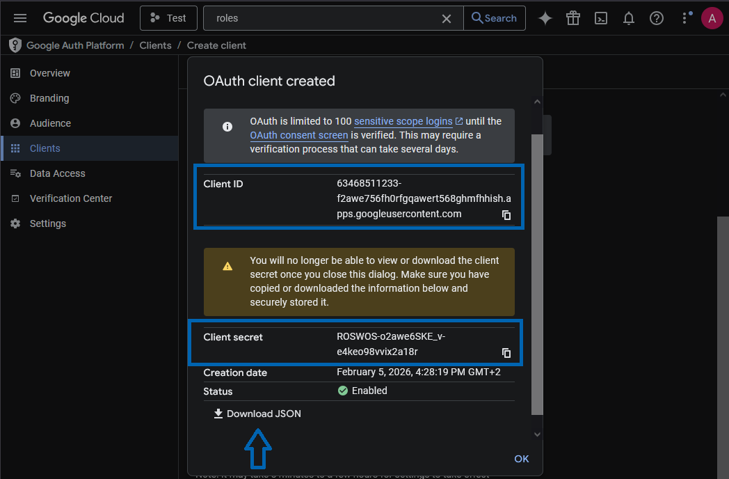 Once created, copy the client_id and client_secret. Optionally, you can download them as a JSON file.